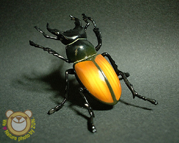 伊豆諸島の御蔵島、神津島のみに奇跡的に生き残ったクワガタ。近種は遠く離れた中国大陸に棲んでいる。成虫は5〜6月に多く見られ、エサも食べずに林床を歩き回る変な習性を持つ。移動は歩行のみで飛ぶことはほとんど無い。体色は全身黒色だが、中には頭と胸が赤いものや、翅に黄色の紋様を持つものもいる。黄紋型は数が少なくとても貴重。アゴは比較的小さい。造形的には、頭と胸が少し褐色の種を再現。形といい艶といい、甲虫類のリアルさは、まさに松村しのぶワールドの真骨頂。これは、オフィシャルブックの『チョコQ百科』に付属された超黄紋型である。黄金に輝く背中がため息モノである。